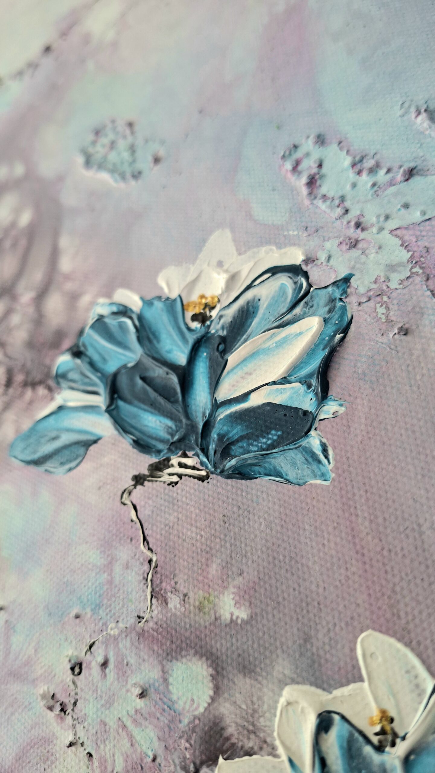 Tyrkysové 3D květiny jsou zhotoveny texturou. Technika na tomto moderním obraze je zvolena malířskými špachtlemi různých velikostí. V tyrkysových květech je použita zlatá barva.