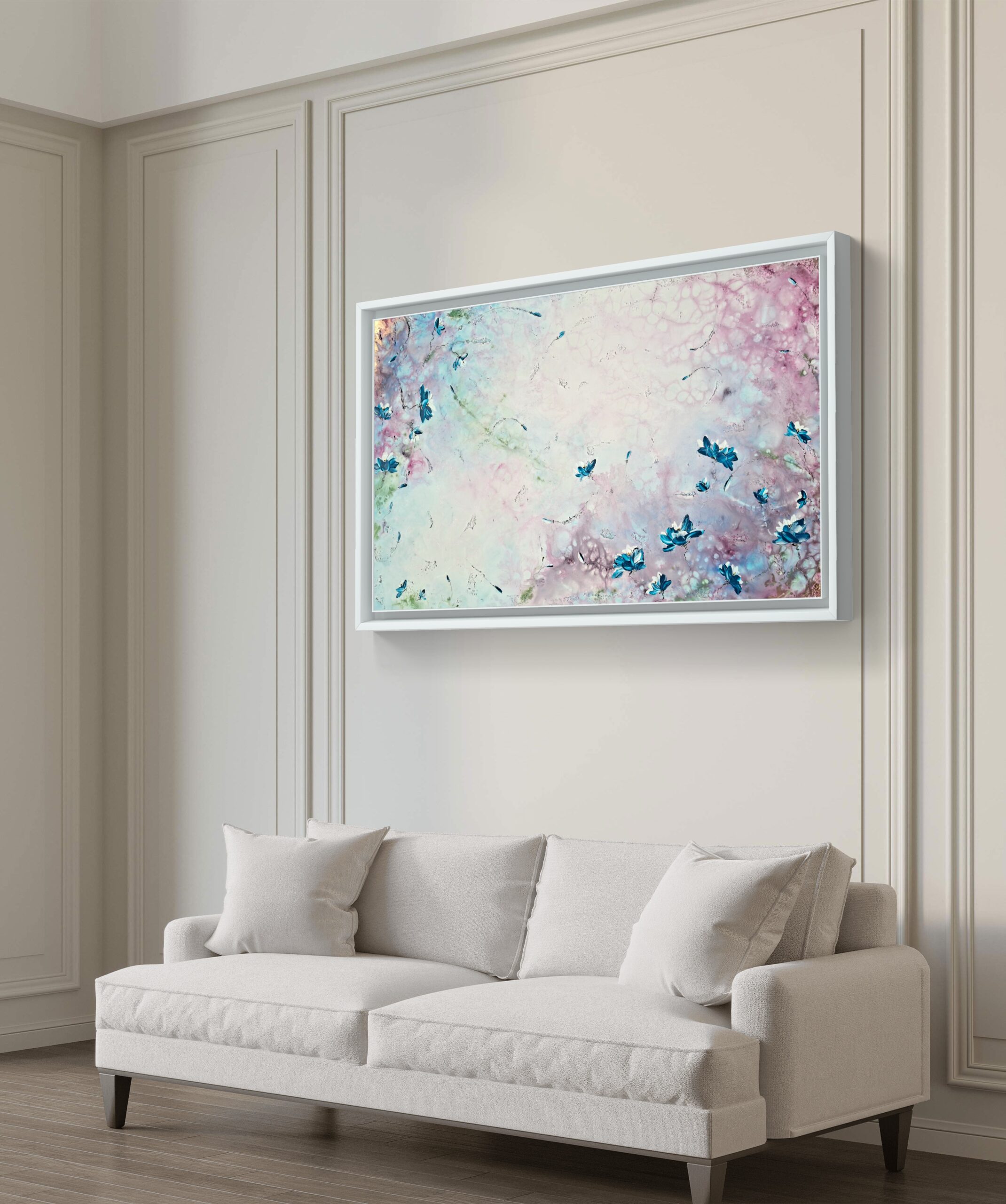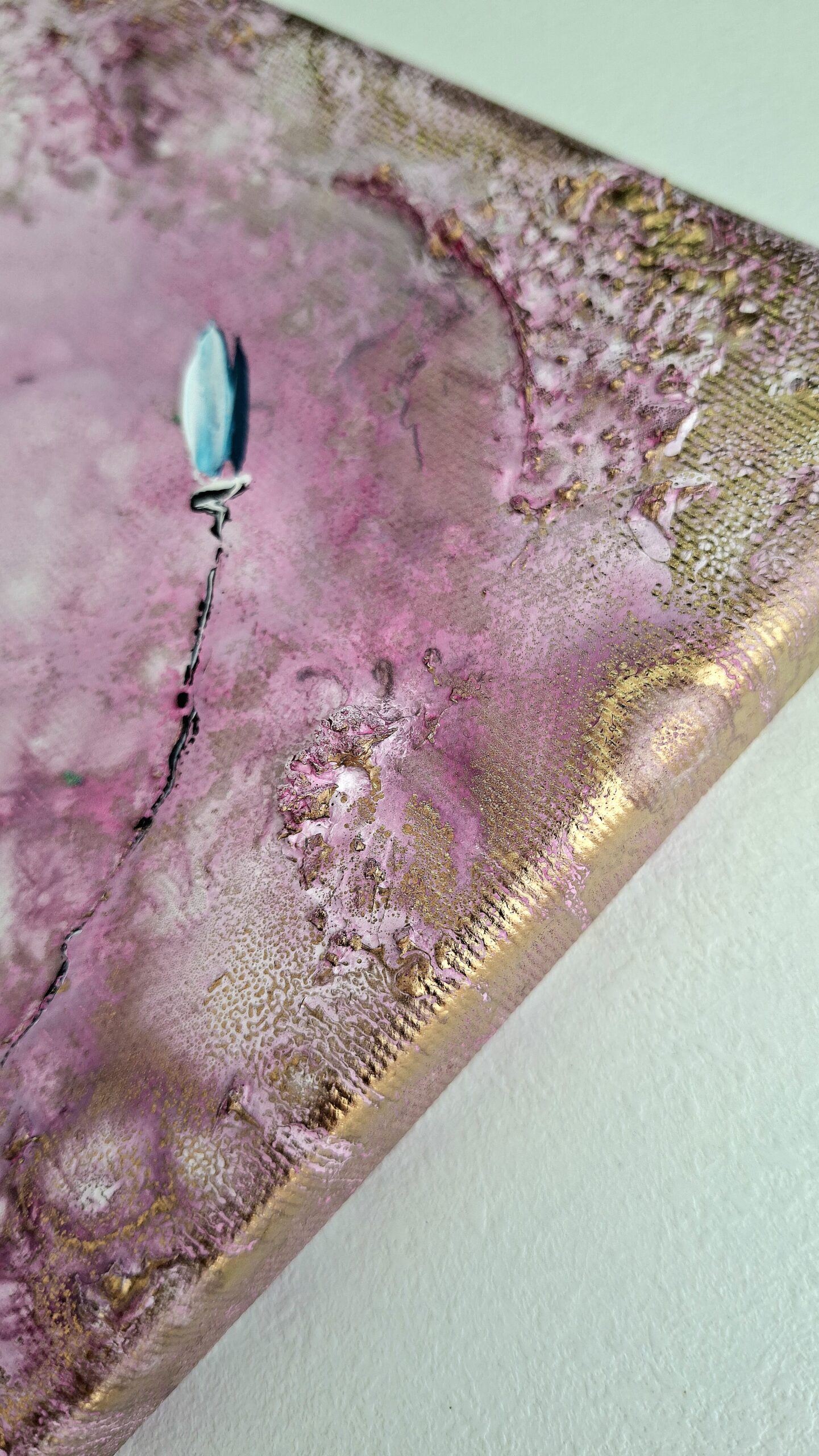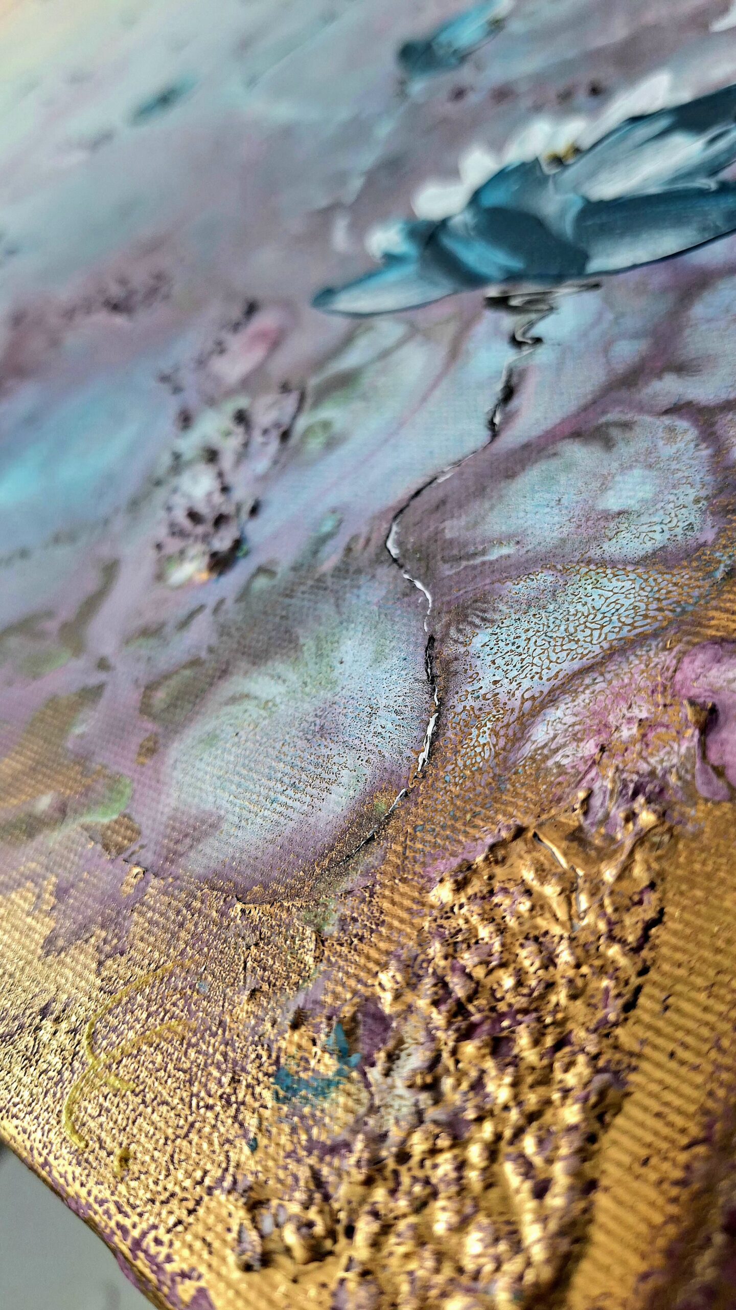 Použité jemné tóny v růžovo/fialkových barvách v kompozici tyrkysových tónů a jemně zlatého orámování rohů obrazu v estetickém výsledku, vyvolává pocit pozitivní harmonie a stabilní rovnováhy.